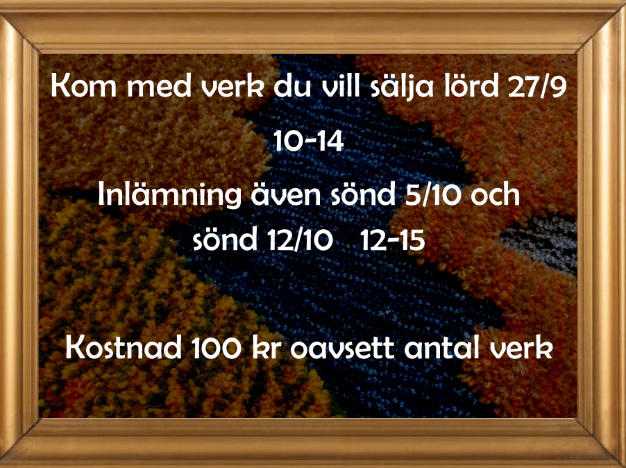 Kom med verk du vill sälja lörd 27/9 10-14 Inlämning även sönd 5/10 och sönd 12/10 12-15 Kostnad 100 kr oavsett antal verk